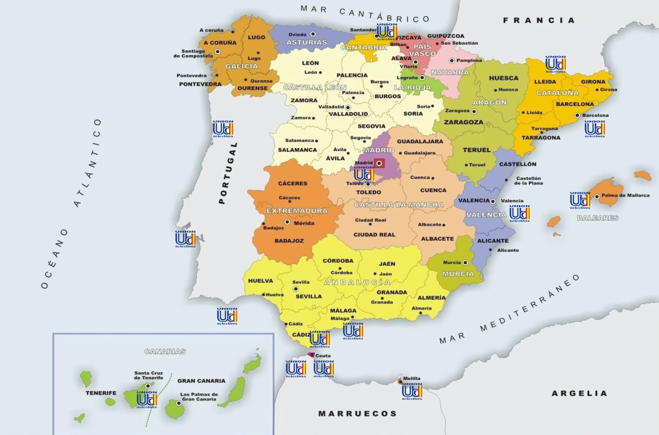 La infraestructura que ofrecemos, tanto propia como de asociados, nos permite dar una respuesta rápida e inmediata al disponer de personal distribuido por toda la Península Ibérica así como en las Islas (Baleares y Canarias) y Ciudades Autónomas (Ceuta y Melilla).